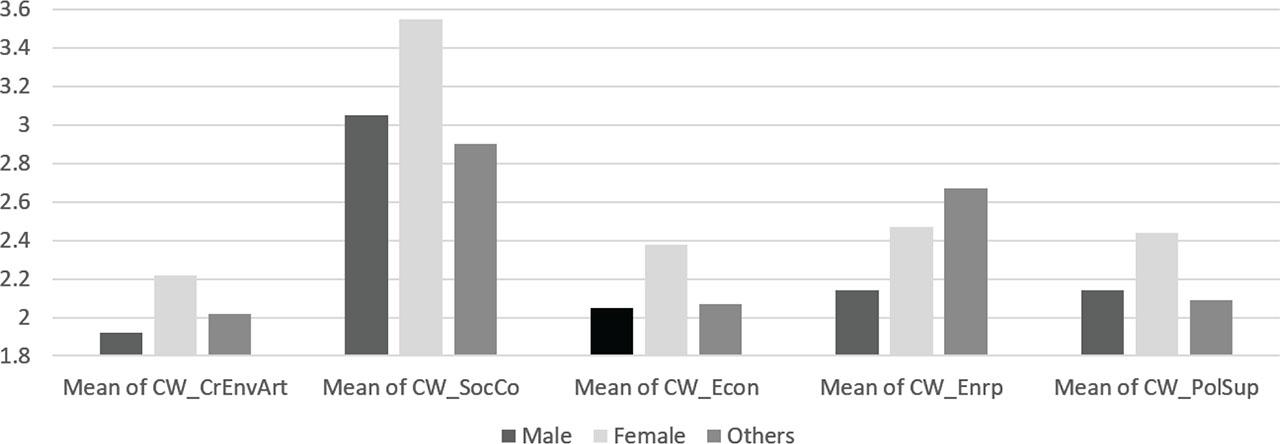 Furthermore, the results demonstrate significant differences between genders in creative environments and activities, social cohesion, economic contribution, diversity of function, motivation of entrepreneurs, and political support. The results show significant differences in perceptions of creative environments and activities (F (2, 244) = 3.361, p<0.05), social cohesion (F (2, 244) = 4.010, p<0.05), economic contribution (F (2, 244) = 3.848, p < 0.05), diversity of function (F (2, 244) = 2.371, p<0.10), motivation of entrepreneurs (F (2, 244) = 4.323, p<0.05), and political support (F (2, 244) = 2.604, p<0.10) for different genders.