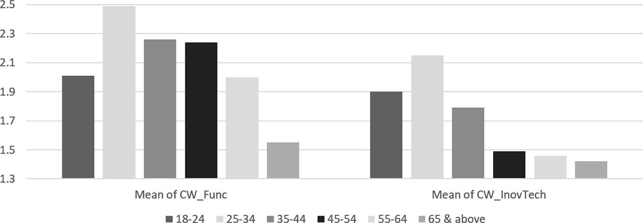 Based upon Tables 5 and 8, Figure 4 shows the differences in the range of function between respondents ages 18–24 and 25–34. The age group of 18–24 is more likely than age groups 25–34 to believe in diversity of function (mean = 2.481). The differences among age groups are the most notable and substantial (mean difference = 0.464). A significant difference in the ‘Innovation and Technology’ variable is evident between 25–34 and 45–54, as well as between 25–34 and 55–64. Participants aged 45–54 and 55–64 were significantly more inclined to agree with “Innovation and Technology” than those aged 25–34 (mean = 2.145). The mean difference between these two age groups is significant (mean difference = 0.549 and 0.679, respectively).