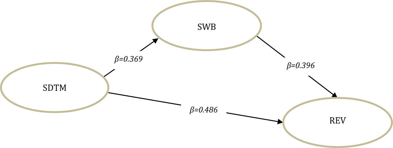 As a result of the analysis, it was determined that self-determined travel motivation had a positive and significant effect on participants' subjective well-being (β_(SDTM → SWB) = 0.369, p < 0.000). On the other hand, the present study suggests that subjective well-being has an effect on revisit intention. In this context, H2 (Subjective well-being of local tourists visiting Igneada positively affects revisit intention) was supported (β_(SWB → REV) = 0.396, p < 0.000).