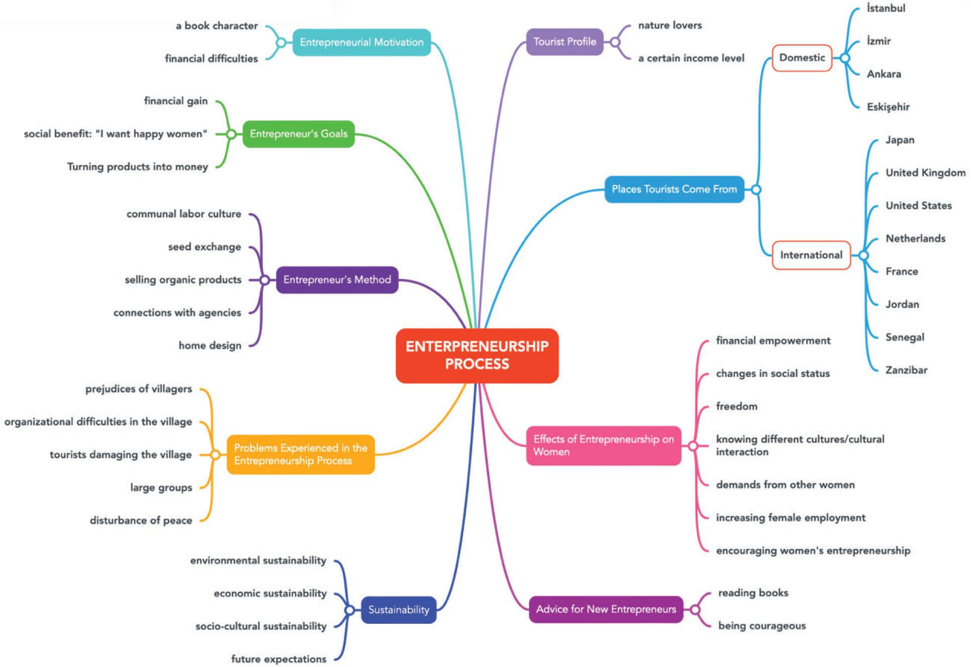 The second main theme, “Entrepreneurship Process” (Figure 3), includes seven themes, 32 codes, and 12 subcodes. To collectively present the themes, codes, and subcodes of the two main themes, an online mind-mapping software, “Mindmeister,” was used. This mind map was then utilised in the analysis process, where the raw data was processed according to the themes, codes, and subcodes depicted in the mind map. The computer-assisted qualitative data analysis software, ATLAS.ti, was employed for processing the raw data. In order to ensure the transparency of the analyses, data quotations from the interview text related to the relevant themes, codes or sub-codes were included as needed. In all data excerpts presented in the study, “Participant” is abbreviated as “P.” In this way, through content analysis, all main themes, themes, codes, and sub-codes identified in the interview transcripts were examined, and relationships were determined.