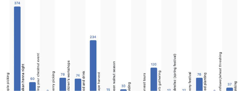 P: “As part of our ecotourism activities, we organize harvest tours. We start with herb collection events in April. In May, we hold Hıdrellez and peony events. Our mountains are known for their beautiful peony flowers. Currently, for example, we are in cherry season, and throughout June, we conduct cherry picking events. During the grape harvest festival, we visit Bedi Village, where exquisite grapes are grown.” P: “In the children’s camps, I have the children plant garlic. I give them local seeds to hold in their tiny hands and have them plant flowers, lavender, corn, and other crops. We work with the children in the fields. The children’s camps have their own teachers, and we organise many activities for them.” P: “An additional fee is charged for the Balkan Henna Night, as it is a separate event with traditional costumes and live music. This includes costs for darbuka, violin, henna, and organizational expenses. The costumes are washed and ironed afterwards.”