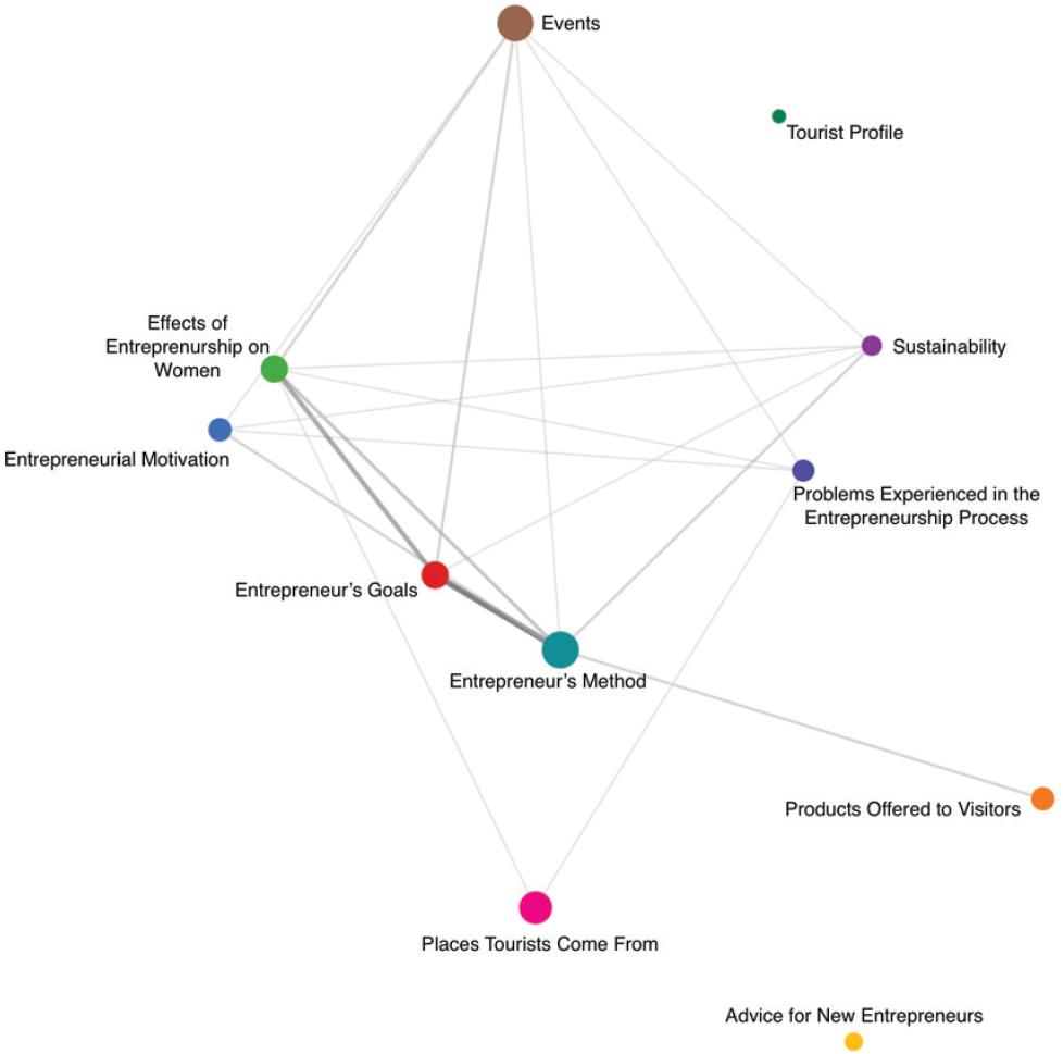 Figure 6 illustrates the co-occurrence and relational positions of the themes. The thick line between the themes “Effects of Entrepreneurship on Women,” “Entrepreneur’s Goals,” and “Entrepreneur’s Method” indicates a strong and shared relationship among these codes. The size of the coloured dots is directly proportional to the amount of data coded to the respective theme.