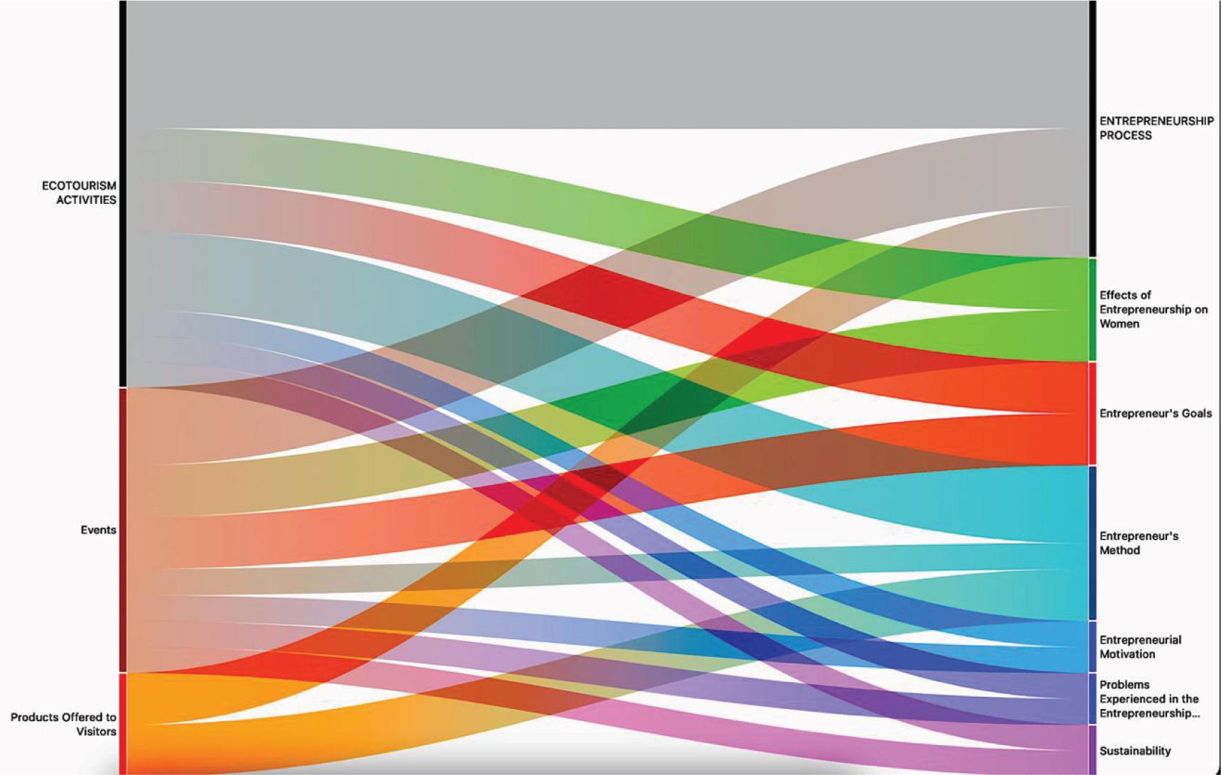 In the diagram, the direct or indirect relationships between themes are represented through coloured ribbons. In this diagram, the ribbons representing higher-correlated codes are visualized more thickly. At the top of the ribbons, the two main themes with the most data processed are visible. The diagram indicates that the theme “Entrepreneur’s Method” has both a direct and strong relationship with the main theme “Ecotourism Activities,” as well as with the themes “Events” and “Products Offered to Visitors.” Thus, the diagram allows for the observation of both direct and indirect relationships among all the main themes and sub-themes.
