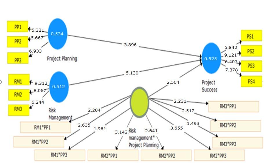 | Results and data analysis | This section contains a measurement model and a structural model. As the first step, the validity of the measurement model is assessed using Cronbach’s alpha, composite reliability, AVE and Fornell-Larcker test. Once the validity of the model is confirmed, the structural model is used to test the research hypotheses using a path coefficient. It also contains the variability assessment and the effect that the size of latent variables has on the endogenous variable. The results showed a significant relationship between project planning and project success as well as the moderating effect of risk management on considered variables |