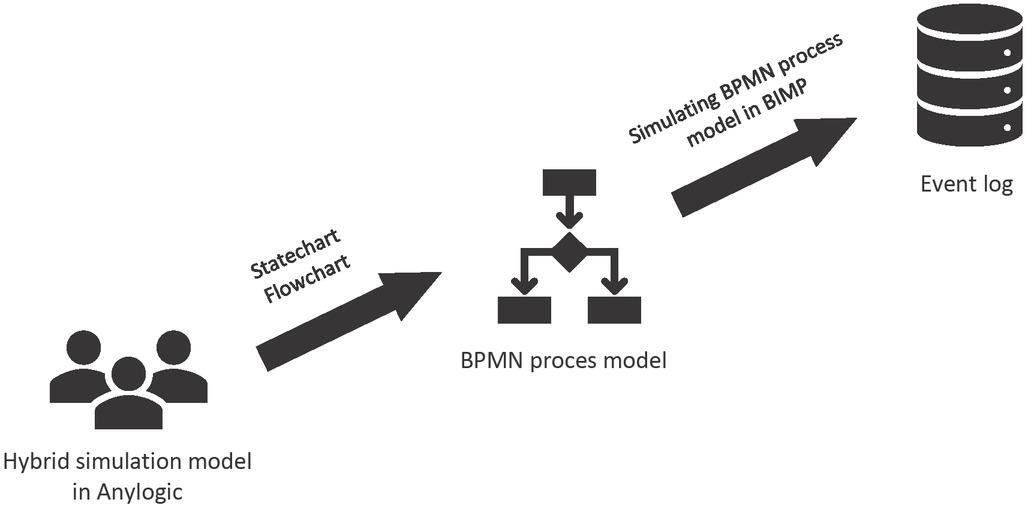 Furthermore, as stated in the Introduction section, the main advantages of ABS are the autonomy of agents, the complexity of the models etc. The autonomy of agents allows them to make decisions and, thus, determine the control-flow in particular process instances through such decisions. However, automated process discovery techniques are mainly focused on relations between occurring events and their sequence, and not necessarily on the reasons why the behaviour occurred. Thus, by expressing the behaviour of the modelled system using the BPMN notation, all the information relevant to automated process discovery techniques is preserved. While simulating the BPMN model in the business process simulator BIMP to acquire an event log, each event has to have a timestamp, so it can be ordered within the trace and, thus, processing times and arrival distributions of process tasks have to be defined for the purpose of generating an event log in the BIMP simulator. Where possible, parameters were used from the hybrid simulation model; otherwise, they were made artificially. However, it is necessary to keep in mind that this does not pose a problem to the validity of the event log because the interest is not in the performance of the process itself and, thus, particular timestamps, but rather in the control flow of the process.