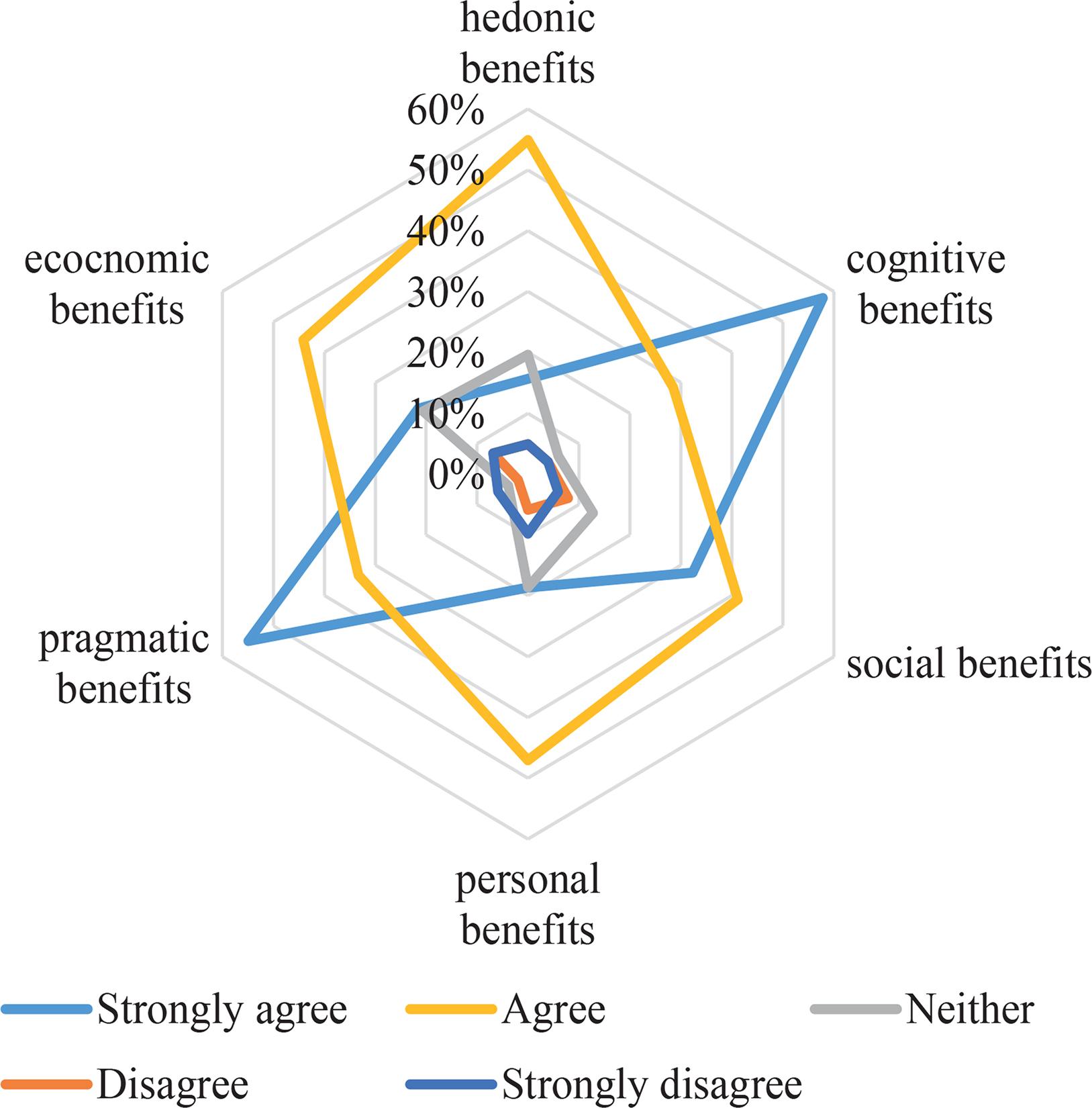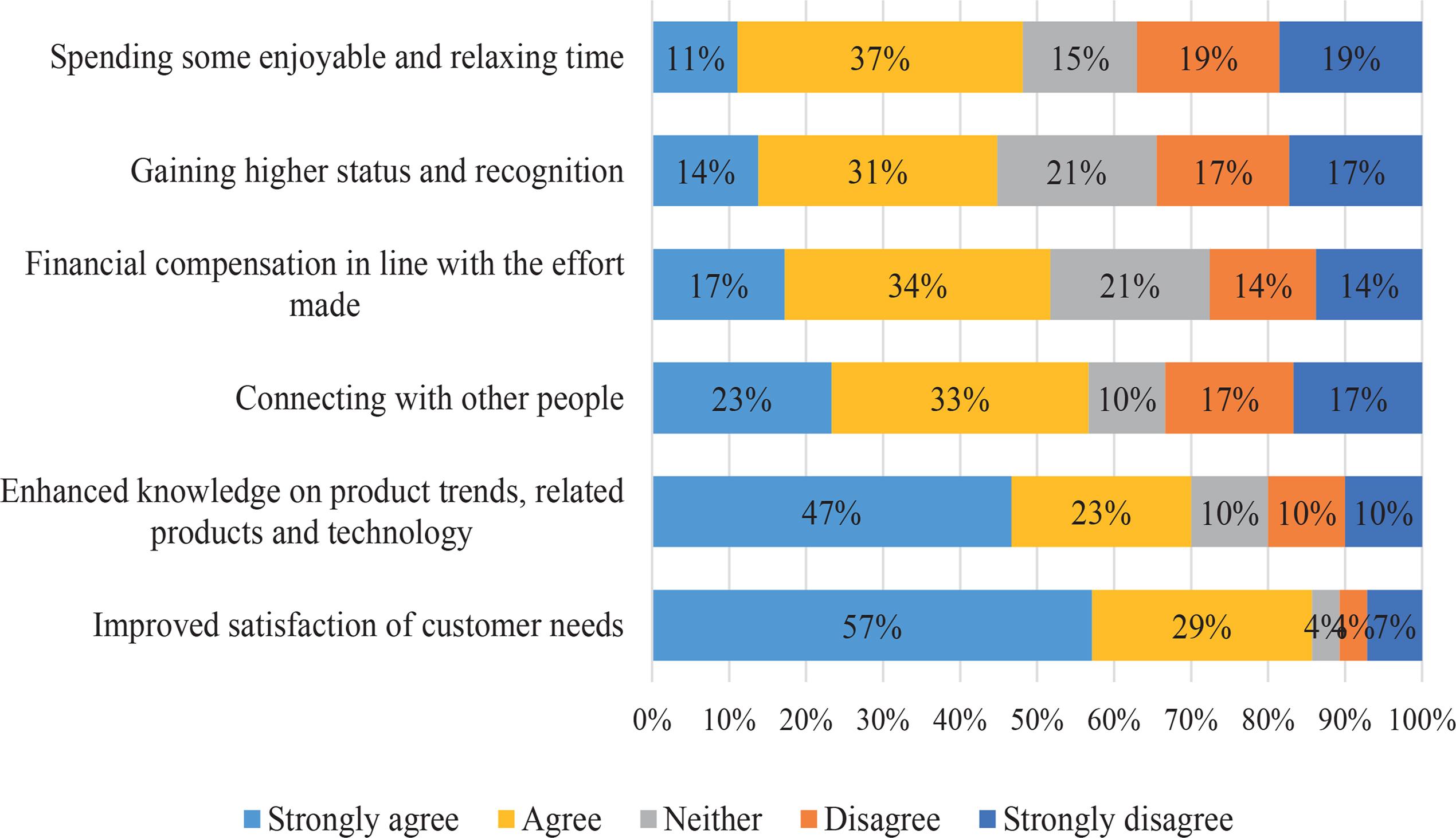 However, 81% of all respondents indicated their interest to participate in co-creation activities related to NPD processes in the future. The most popular reasons for such interest were enhanced knowledge of product trends, related products and technology (47% — strongly agree; 23% — agree), improved satisfaction of customer needs (57% — strongly agree; 29% — agree) and a possibility to spend some enjoyable and relaxing time (23% — strongly agree; 33% — agree; Fig. 1).