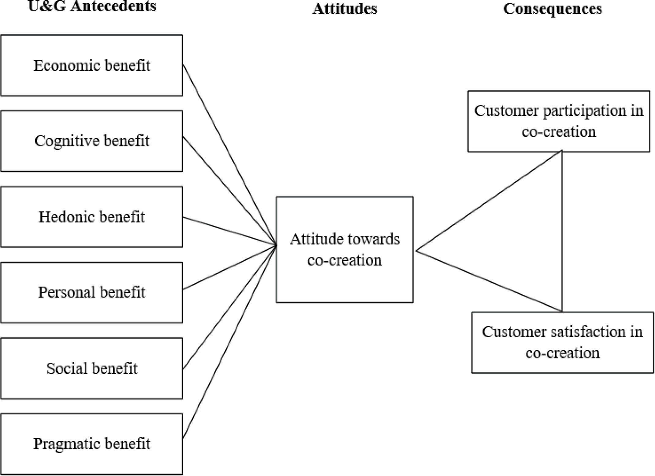 The proposed model consists of three variables, namely “antecedents”, “attitudes”, and “consequences”. The first variable of the U&G theory (Katz et al., 1974), “antecedents”, explains the motivations a customer could have to co-create on a voluntary basis. These motivations are based on Fuller’s (2010) classification of benefits and, respectively, are economic, cognitive, hedonic, personal, social and pragmatic. These antecedents influence the attitudes of a user towards participants in co-creation and the subsequent actions. The variable “attitudes” describes what attitudes the customer has towards co-creation, considering previously mentioned benefits. The final variable “consequences” interprets how the attitudes are transferred into actions. These “consequences” include “customer participation in co-creation”, whether users have participated in any kind of customer involvement, which is based on typology of customer co-creation developed by O’Hern and Rindfleisch (2010) and includes codesigning, tinkering, collaborating and submitting; and “customer satisfaction in co-creation” which explains the benefits expected by the users to satisfy them sufficiently during co-creation.