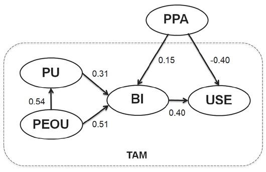 As shown in Table 5, all postulated relationships between the constructs were highly significant at p < 0.001, with one exception: the relationship between PPA and BI (referring to H4) was statistically significant at p < 0.010.