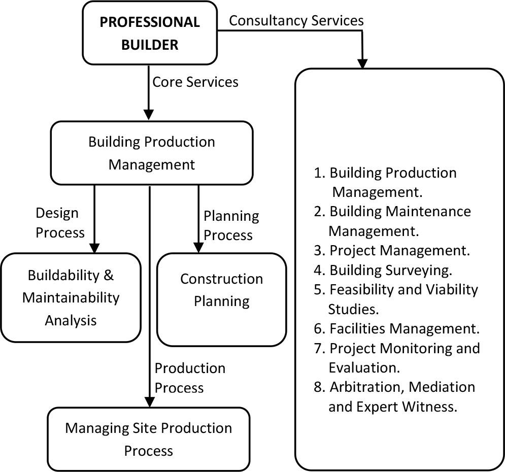 According to Osuizugbo (2018), in the building construction industry, engineers undertake calculations and analyses to produce a design solution; in other words, just like architects, engineers produce the design solution of a building project. Osuizugbo (2018) went further to described builders as professionals that have an analytical mind, by virtue of their training to organise and coordinate the activities of the tradesmen, subcontractors, and suppliers as well as to manage the entire building production process from the beginning to handover, with a view of ensuring that the project is completed on time, within the cost, and to specify the quality standard by utilising the most optimal construction methodology, also including other unique roles attributed to builders in the building project delivery. According to Bamisile (2004), building production management is the main role of professional builders; and in addition, builders have other major consultancy services. These consultancy services are shown in Fig. 1.