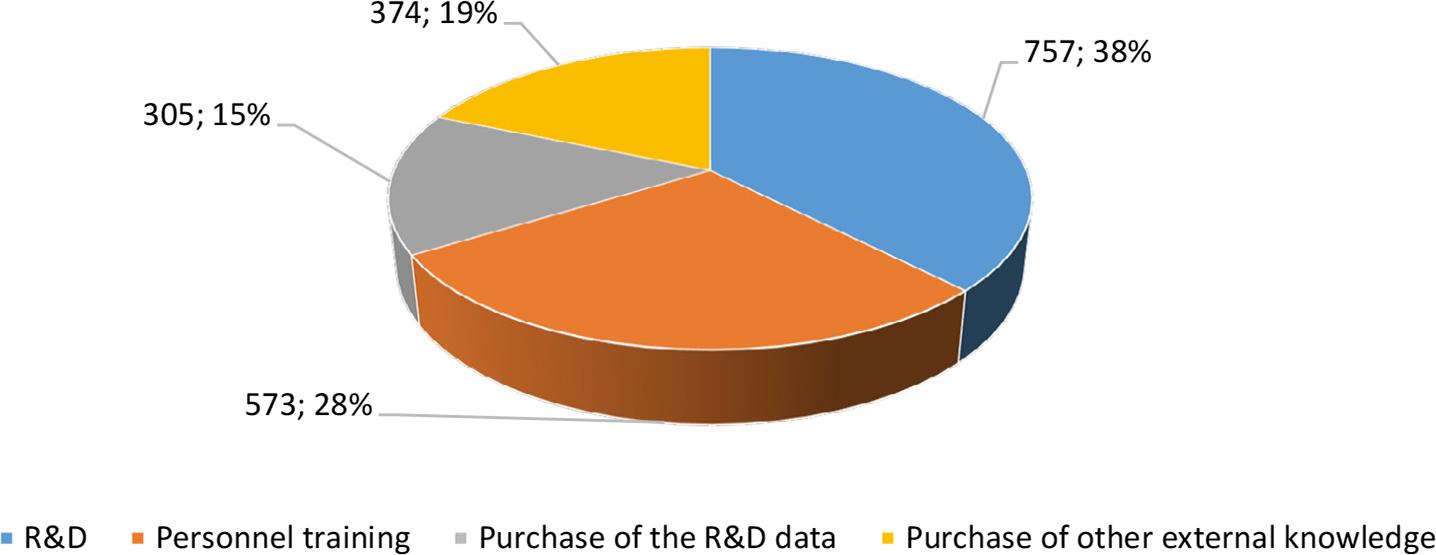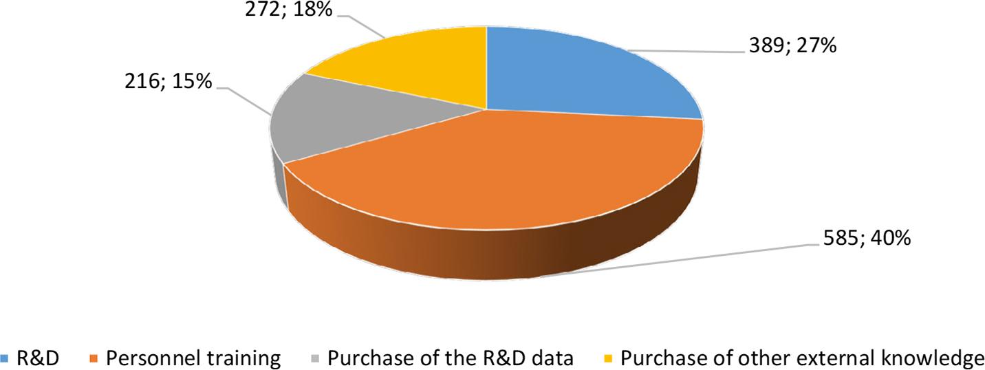 It should be noted that the authors consider knowledge as a set of ordered rules and facts, which allows solving problems in a particular subject area. Knowledge is an intellectual commodity and an object of market exchange. From the whole set of knowledge, the authors explored the formalised documented knowledge (both theoretical and empirical), in particular, technical and technological knowledge presented as patents, algorithms, technologies, drawings, etc.; professional knowledge embodied in skills, know-how, work techniques, skills, experience, etc.; scientific knowledge presented in ideas, theories, hypotheses, patterns, laws, concepts, etc.