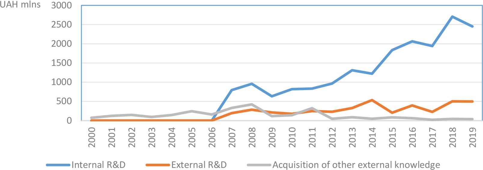 Fig. 5 presents the expenditure volumes by areas of innovative activity in 2000–2019. According to statistical reports, the cost of acquiring external knowledge is insignificant compared to other sources of knowledge, and it tends to decrease. It should be noted that in 2017, compared to 2016, the expenditure volumes decreased in all categories. Thus, the expenditures on internal research decreased by 6%, external research — by 42%, and the acquisition of external knowledge — by 66%. In 2018, the first two areas showed positive dynamics, while the expenditures on acquiring external knowledge remained substantially unchanged. 2019 saw a significant decrease in expenditures of all categories: the funding for domestic research decreased from UAH 2 706.2 million in 2018 to UAH 2 449.9 million in 2020 (almost 9.5% less), the funding for external research — by 1.3%, and the funding for the acquisition of other external knowledge — by 18.7%.