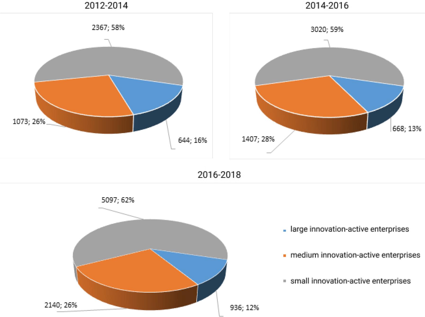In 2016–2018, the number of innovation-active enterprises continued growing in all three categories and reached 5097 (62.4%) small, 2140 (26.2%) medium, and 936 (11.4%) large firms. At the same time, the share of small and medium-sized enterprises was constantly growing while the share of large firms was decreasing.