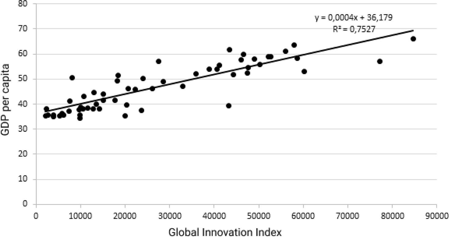 Illiashenko and Rot-Sierov (2016) noted that the possibility for the domestic economy to transit towards advanced innovation was based on the production and commercialisation of new knowledge as a major factor in the formation, strengthening and implementation of competitive advantages. It contributes to the growth of the domestic economy, and consequently, the well-being and quality of life of the Ukrainian population. This fact was confirmed by Shypulina (2017), who’s research substantiated the close stochastic convergence between the country’s Global Innovation Index and GDP per capita (Fig. 8).