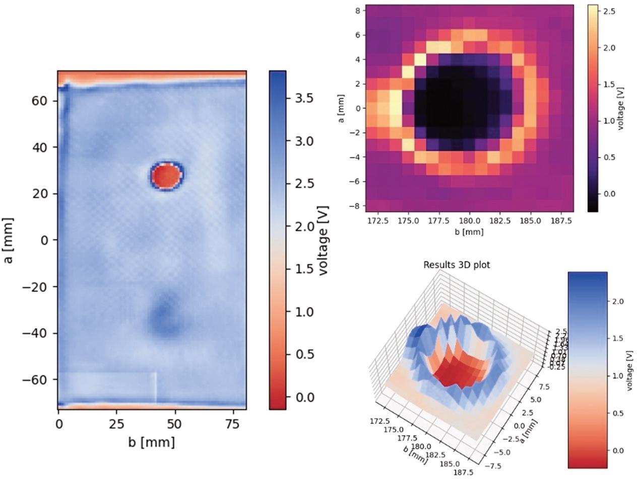 The collected data is visualized as C-scans. Plots are elaborated in different colors: in 2D, which is usually more legible, and in 3D, which can sometimes be more informative in certain use cases.
