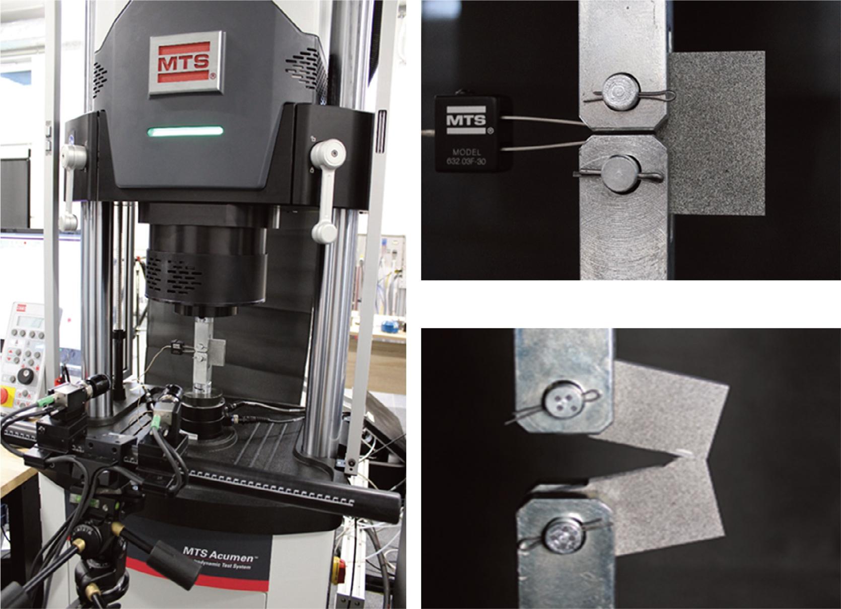 In addition to the crack length measurement method outlined in the relevant standards (ASTM International, 2024), an additional approach based on surface deformation measurements (Digital Image Correlation) was used during the test. For this, the surface of each sample was covered in a special pattern. Correlation of crack length defined using the method described in the standard and using the DIC method is beyond scope of this paper.