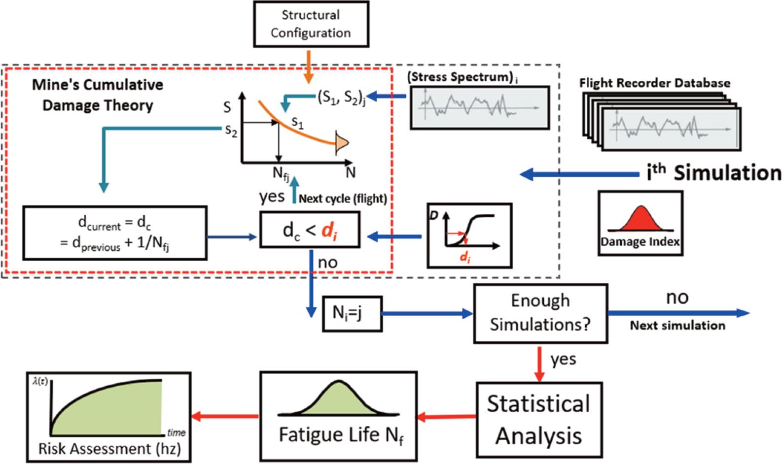 In the methodology outlined in Figure 2, each simulation “i” (e.g., Monte Carlo Sampling) selects a flight spectrum from the flight data recorder or the full-scale fatigue spectrum and a value for the damage model D (e.g. Miner’s Rule), which is frequently normally distributed with a known mean μ and standard deviation σ. If information from test data or experience is not available for the damage model, initial values of μ = 1.0 and σ = 0.1 are recommended.