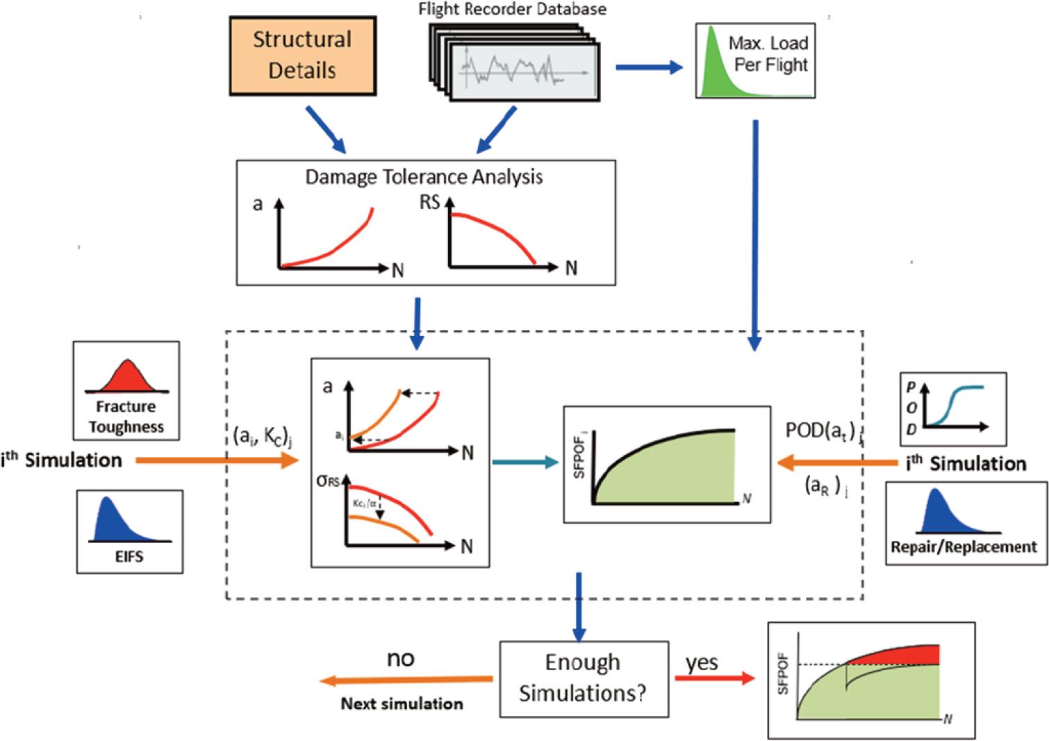 The crack growth analysis is then used to conduct the inspection simulation at a predetermined flight number or required risk level. Detected cracks are repaired, restoring the structure’s residual strength. After sufficient simulations, the expected value of all POF realizations is computed.