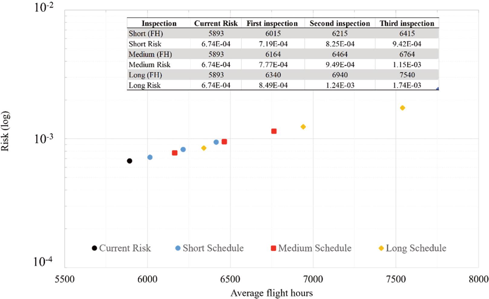 Figure 6 shows the fleet risk calculated for three different inspection intervals, short, medium and long. After reviewing the results of the analysis, it is noticeable that the difference between the short and long schedule is only marginal and does not exceed the risk limits established in the fleets SSPP. Thus, the increase of the inspection intervals from short to long while balancing operational efficiency and the required high safety standards is possible. Moreover, the conservative nature of the model provides an addition safety margin as the model does not account for the possible installation of a modified part with an increased fatigue life.