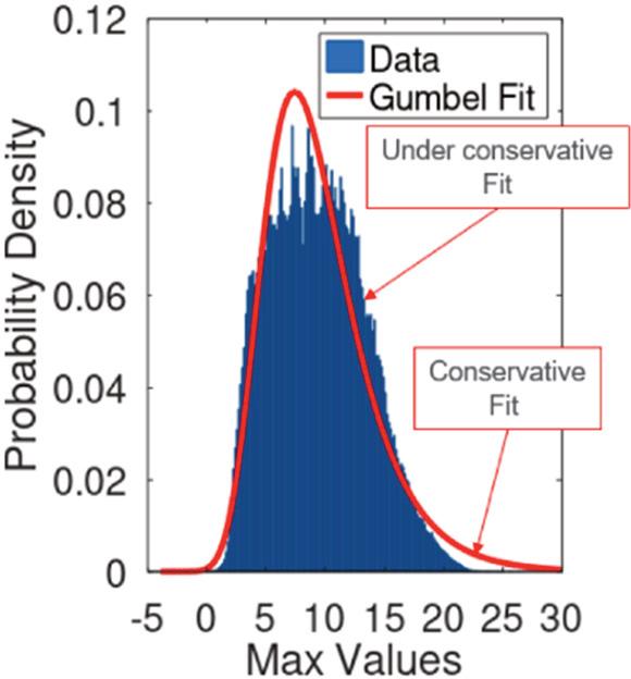 The aircraft load was extracted from an existing database of flight loads and onto that a stress multiplication factor was applied. The data was then fitted using a Gumbel Extreme Value Distribution in order to obtain a continuous data set. The obtained fit is shown in Figure 8 and is conservative for large loads (the end of the right tail of the distribution allows for higher loads than in real life) and under conservative for medium loads.