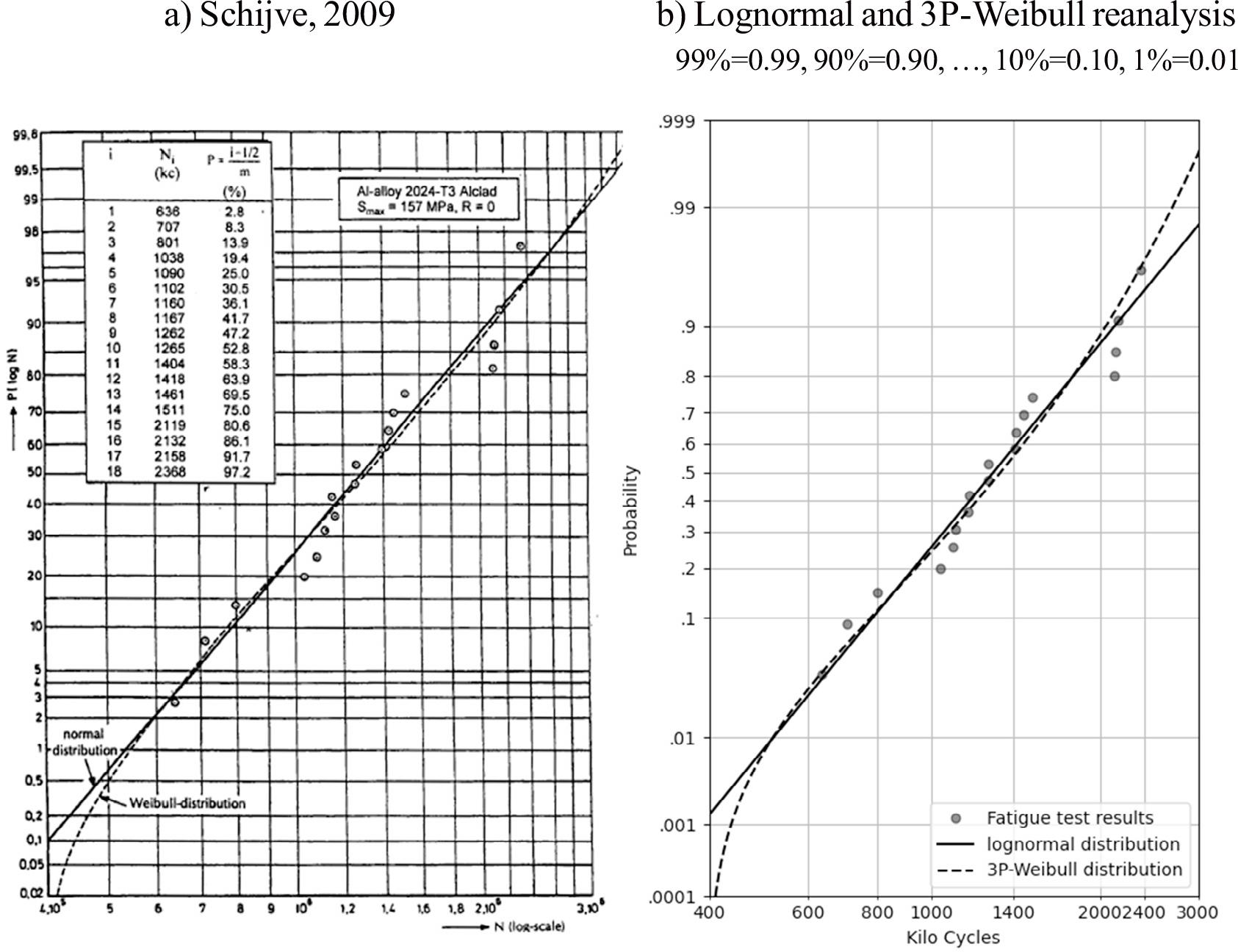 The Schijve dataset (Schijve & Jacobs, 1955), shown in Table 1, are fatigue test results reported in 1955 for 18 flat sheet specimens of 2024-T3 aluminium alloy, 2.0 mm thick, unnotched, Kt = 1.15, tested in constant amplitude with Smax = 157 MPa and R-ratio = 0. Schijve reported the distribution of these fatigue test results using a lognormal distribution in (Schijve & Jacobs, 1955, figure 9.2), and a lognormal and 3-parameter Weibull distribution in (Schijve, 1992, figure 1b and 2b). The text of Schijve & Jacobs, (1955) and Schijve (1992) define the lognormal distribution as a normal distribution where the variable is defined in logarithmic terms. In this case, x = log(N), where N is the fatigue life expressed in number of cycles to separation failure. Schijve Fatigue and Structures of Materials (Chapter 12: Fatigue and Scatter) shows these fatigue test results with a lognormal distribution and a 3-parameter Weibull distribution in the same plot. This is reproduced in Figure 1a (Schijve, 2009, figure 12.3). Figure 1b shows a comparison of the reanalysis of these data for the purposes of this paper. These show that the results agree equally well with both distributions, and that the differences between the distributions are in the lower and upper tails of the distribution. Identifying the distribution that best fits the lower tail, where the probability of failure is low, is the most important. In Schijve (2009) states: