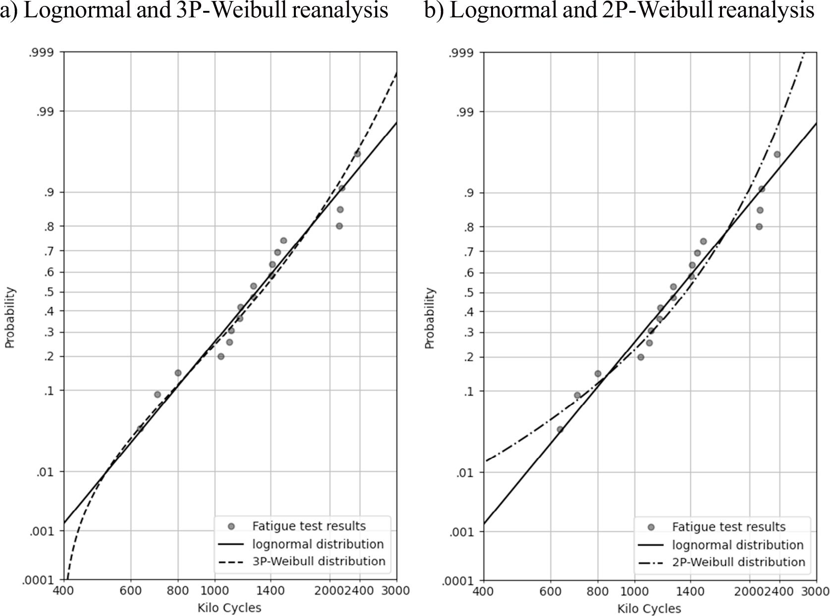 Lognormal and Weibull distribution of Schijve dataset fatigue test results a) with 3-parameter Weibull as used in Schijve analysis (2009), and b) with 2-parameter Weibull as used in Brot analysis in (2017).