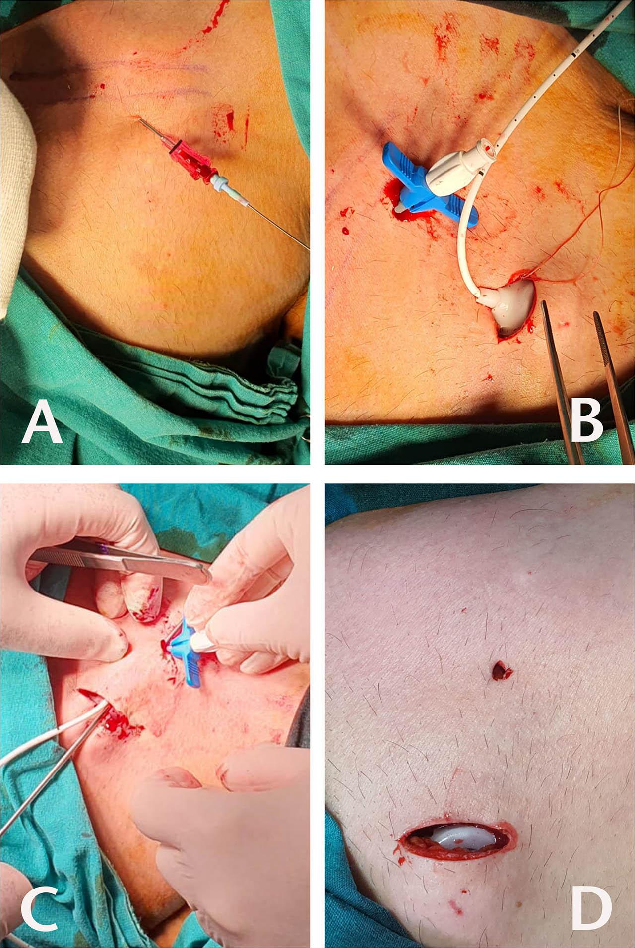 (A) Vascular access via the subclavian vein; (B) port pocket and fixation; (C) placement of the catheter line through the subcutaneous tunnel; (D) post-procedure vascular accesses and port pocket.