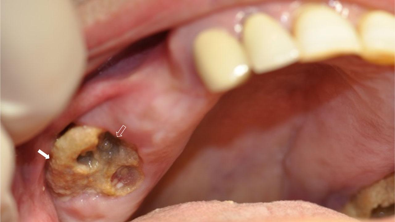 Osteonecrosis of the maxilla, presenting as exposed necrotic bone (compact arrow), after a dental extraction. Sockets without teeth (phantom sockets) (transparent arrow), are seen on the necrotic bone. Patient was asymptomatic at presentation.