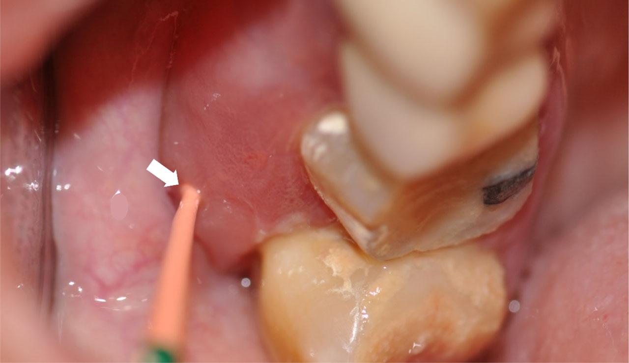Osteonecrosis on the maxilla was diagnosed after probing necrotic bone through a fistula (arrow). A plastic material (gutaperka) was inserted into the fistula to better disclose the fistula. Patient presented with pain and swelling.