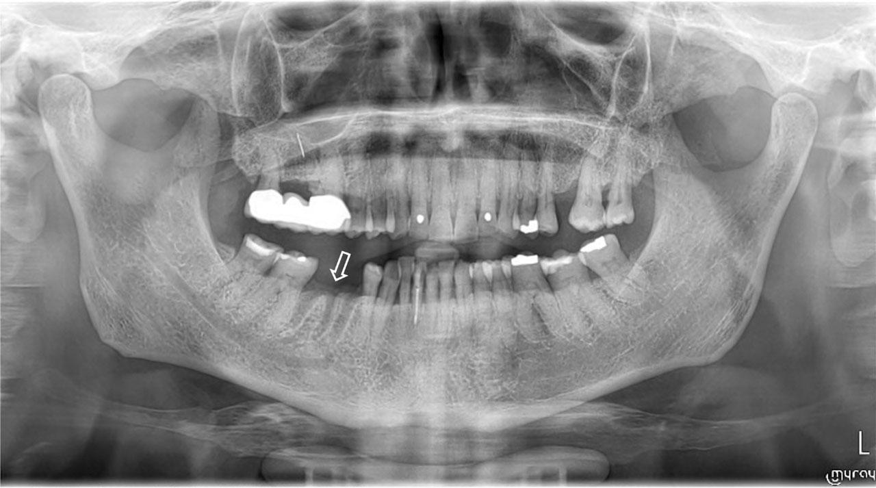 Panoramic radiograph of a cancer patient, who received antiresorptives and presented with a non-healing socket (phantom socket) two months after the dental extraction of the mandibular molar tooth. Patient was diagnosed with MRONJ stage 2.
