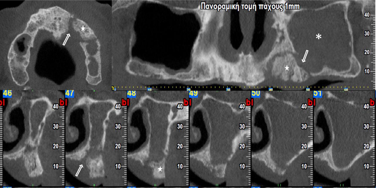 Cone Beam Computed Tomography of a cancer patient, who received antiresorptives. Osteolytic areas (arrows) and bone sequestrum (stars) are observed in the maxilla. Fullness of left sinus is also seen (asterisks). Patient was diagnosed with MRONJ stage 3.