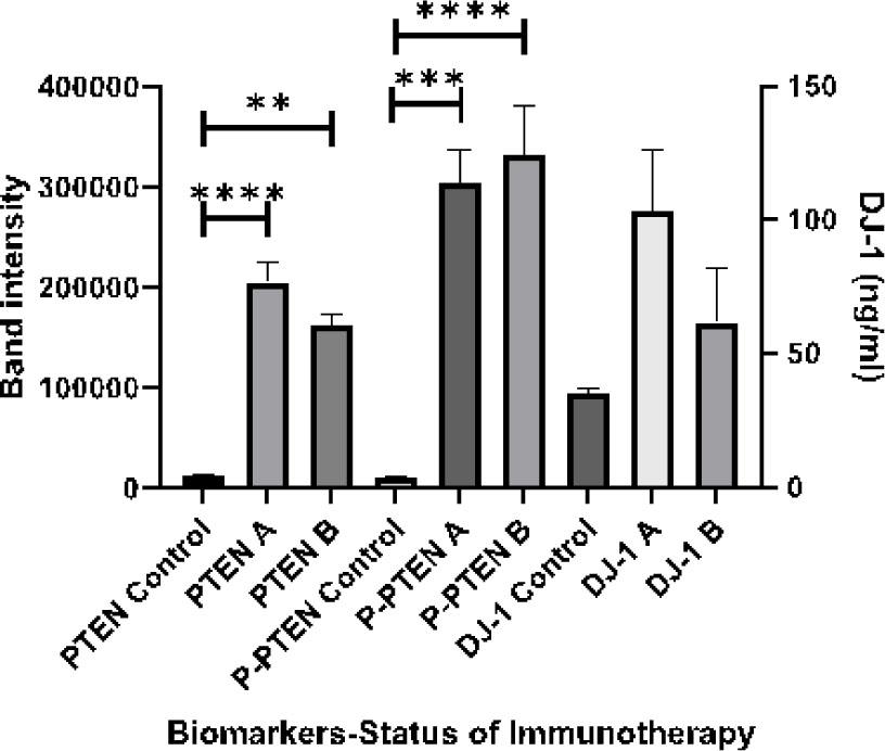 Conclusion: PTEN, P-PTEN and DJ-1 could be further investigated for their use as biomarkers of responses to immunotherapy as well as prognostic markers for various types of cancer.