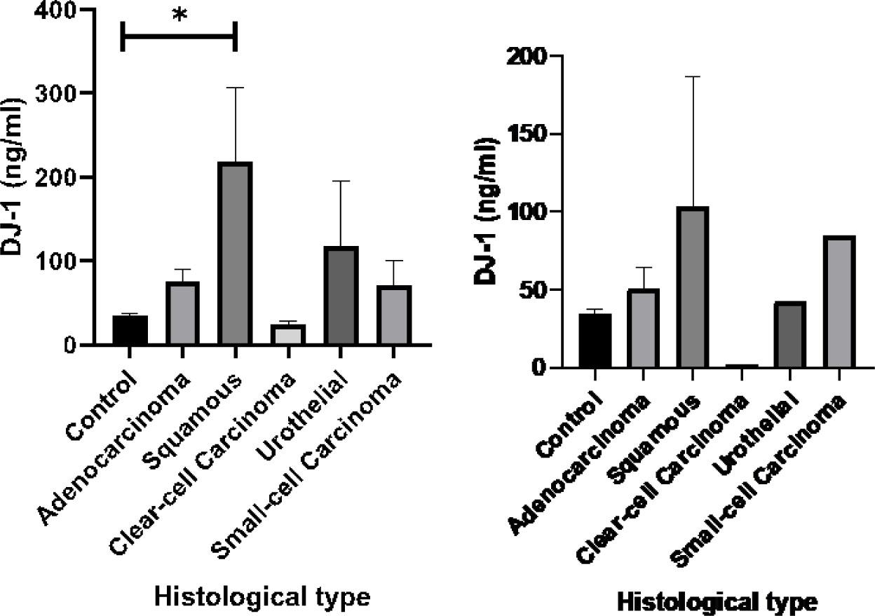 The variation of the DJ-1 biomarker levels regarding the histological type of the cancer before and after performing immunotherapy.