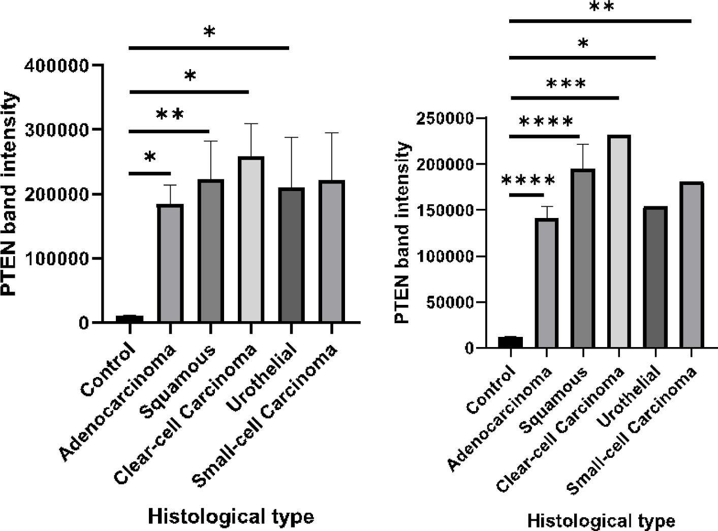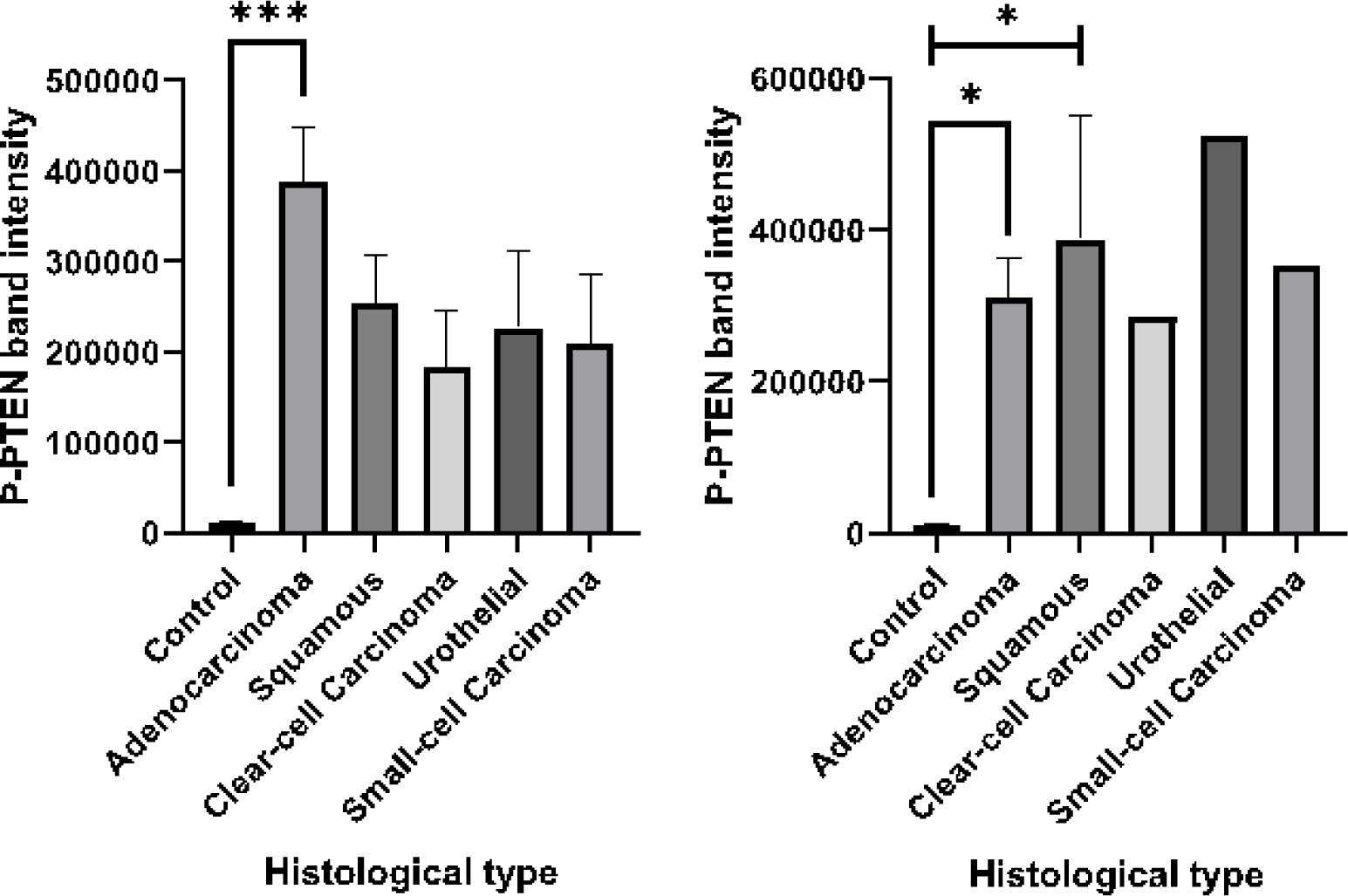 The variation of P-PTEN biomarker levels with respect to the histological type of the neoplasm prior and during immunotherapy.