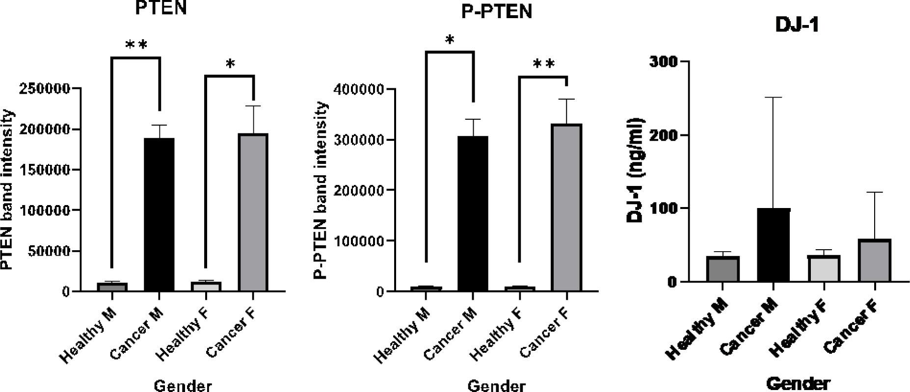 The variation of PTEN, P-PTEN AND DJ1 biomarker levels with respect to sex in cancer patients and healthy adults.