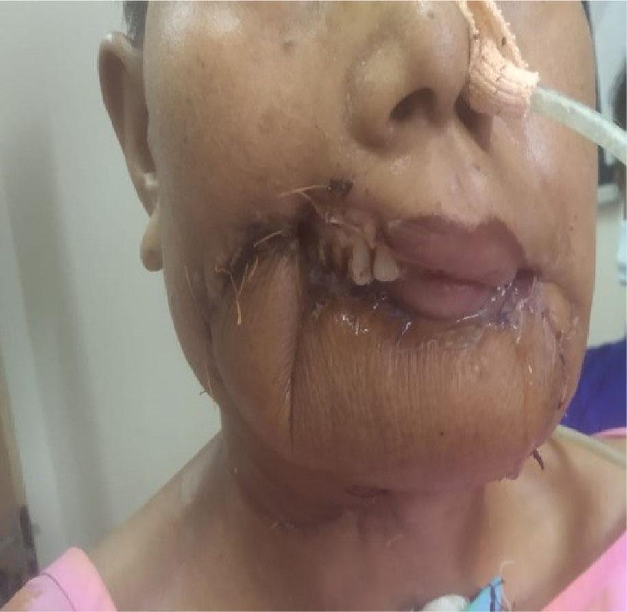 We report here the management of a patient with squamous carcinoma of the oral cavity with fungating growth. The patient was a 47-year-old woman referred from the peripheral health center. The patient otherwise had a good general condition with no associated comorbidity and been leading an independent daily activity. The patient presented history of local wound treatment at the local peripheral health center. The patient was admitted through the outpatient department. On examination of the patient, there was a fungating growth involving the right-side buccal mucosa with involvement of the skin of lower face/check, almost the whole lower lip, the right-side upper lip, mandible, and the floor of mouth but not affecting the mobility of the tongue with malodor emitting from the fungating tumor. There was no associated cervical lymphadenopathy in spite of having the fungating growth. Thus, the TNM stage of the patient was T4N0M0. The patient also complained of a severe pain. Upon admission, local wound care with silver dressing and topical application of metronidazole cream twice daily was started. After 36 hours, the malodor almost completely disappeared and the patient reported reduced exudate with improved tumor appearance. The patient well-being too improved. Systemic or oral antibiotic was not given for this patient. Basic investigations were all normal except hemoglobin 8.2 g/dl. This patient could ultimately undergo definitive curative treatment. Figure 1 shows the fungating tumor, and Figure 2 shows postoperative day 10.