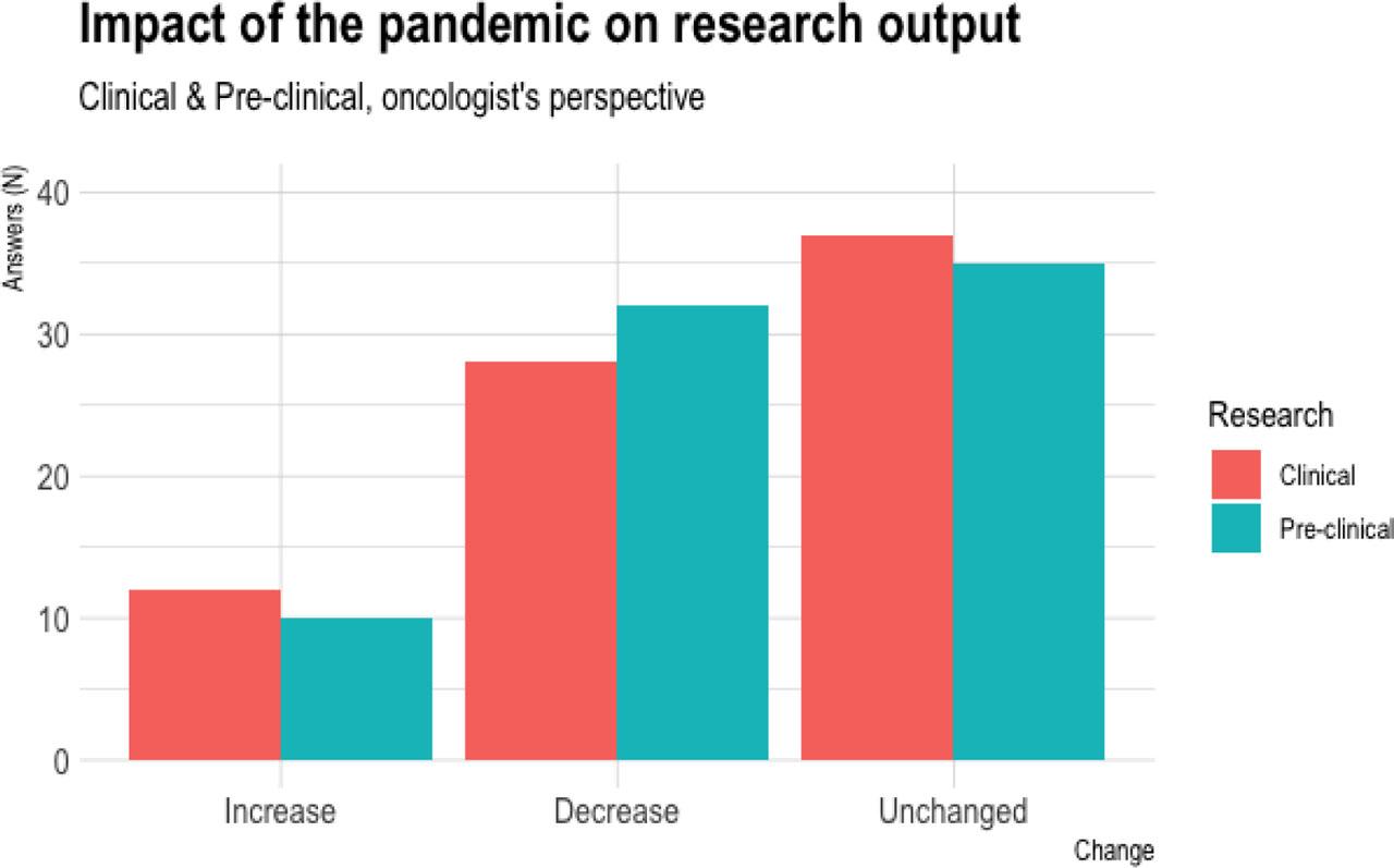 Finally, oncology stands as the most active field in terms of clinical trials, heavily relying on breakthrough treatments and novel combinations of existing ones[28]. Although the pandemic disrupted clinical trials and introduced a new level of complexity[29], these challenging conditions have also spurred innovations and adaptations that might have taken years to implement under normal circumstances. Notably, the field has witnessed the digitalization of processes, a reduction in documentation burden, faster data acquisition, and improved translation of research into clinical practice[30,31]. In our study's cohort, participants reported a decrease in the time allocated to clinical and pre-clinical research by 36.4% and 41.6%, respectively (Table 3, Figure 3). In comparison, ESMO's Survey II notes a persisting reduction in clinical trials and research activities by 65.8% and 55.8%, respectively.