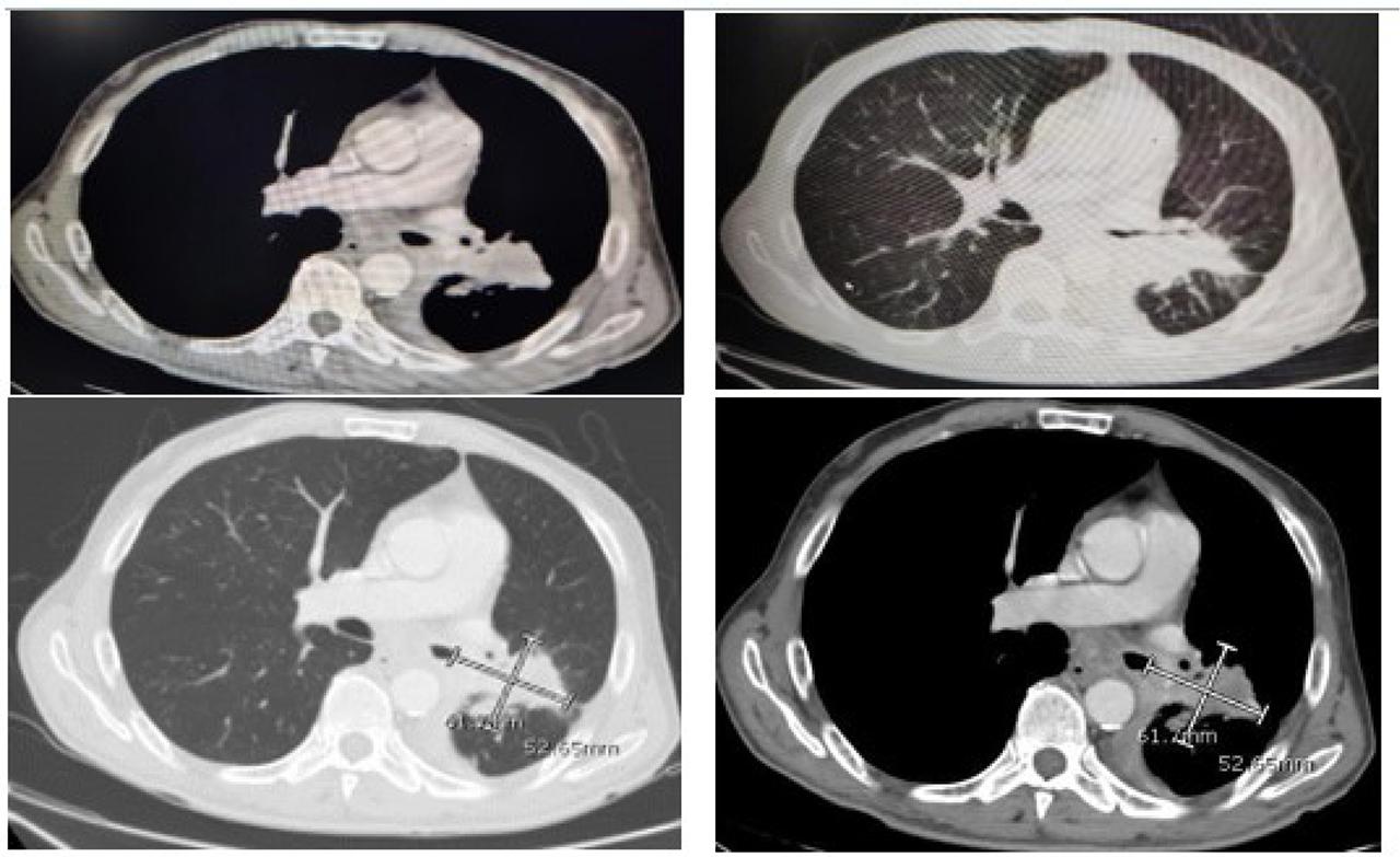 Chest computed tomography (CT) scan: Speculated soft tissue mass seen on the left main bronchus, measuring about 6.1 × 5.2 cm (measured lesion) and associated with subcarinal ln and minimal pleural effusion.