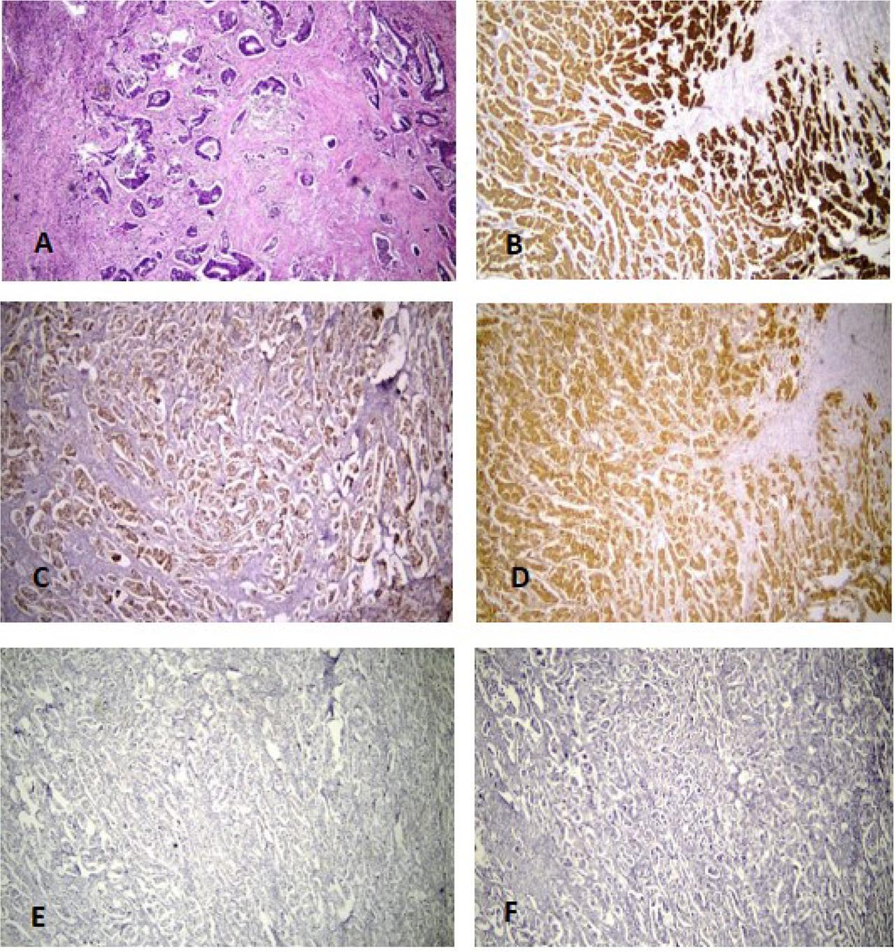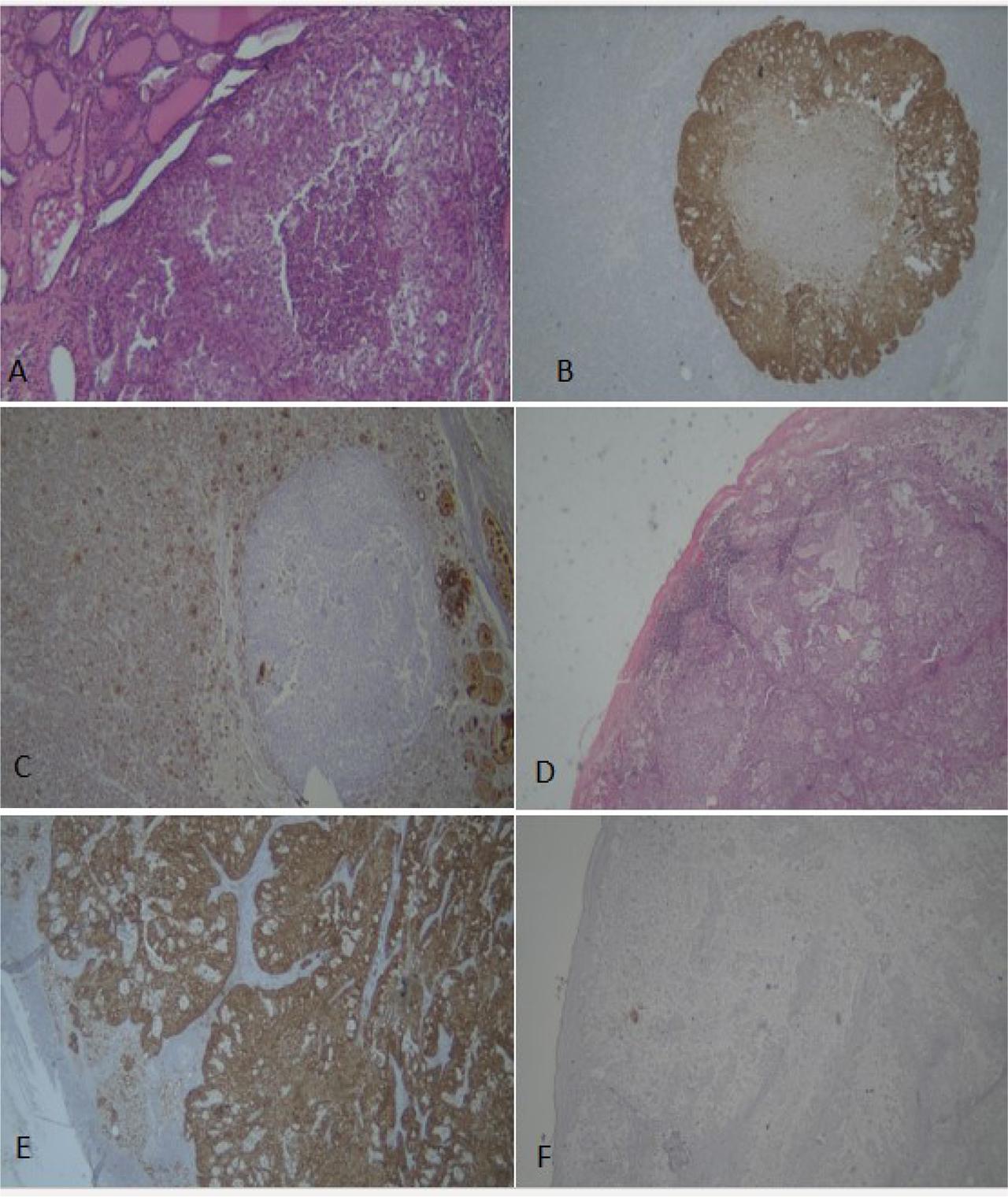 Microscopic examination. (A) (Hematoxylin and eosin; ×20). Photomicrograph that shows infiltration of thyroid gland tissue by malignant tumoral proliferation formed of malignant acini lined by multiple layers of malignant epithelial cells with moderate degree atypia and abundant pale eosinophilic to clear cytoplasm (B) (Napsin A immunohistochemistry; ×20), diffuse positive with negative reaction of the surrounding thyroid tissue. (C) (Thyroglobulin immunohistochemistry; ×10), malignant acini that show negative reaction for thyroglobulin with the positive reaction of the surrounding thyroid tissue (internal control). (D) (×10), Malignant deposits of the cervical lymph node by the same tumor tissue with a small rim of lymphoid tissue on the periphery. (E) (Napsin A immunohistochemistry; ×20), diffuse positive reaction. (F) (Thyroglobulin immunohistochemistry; ×20), negative reaction.