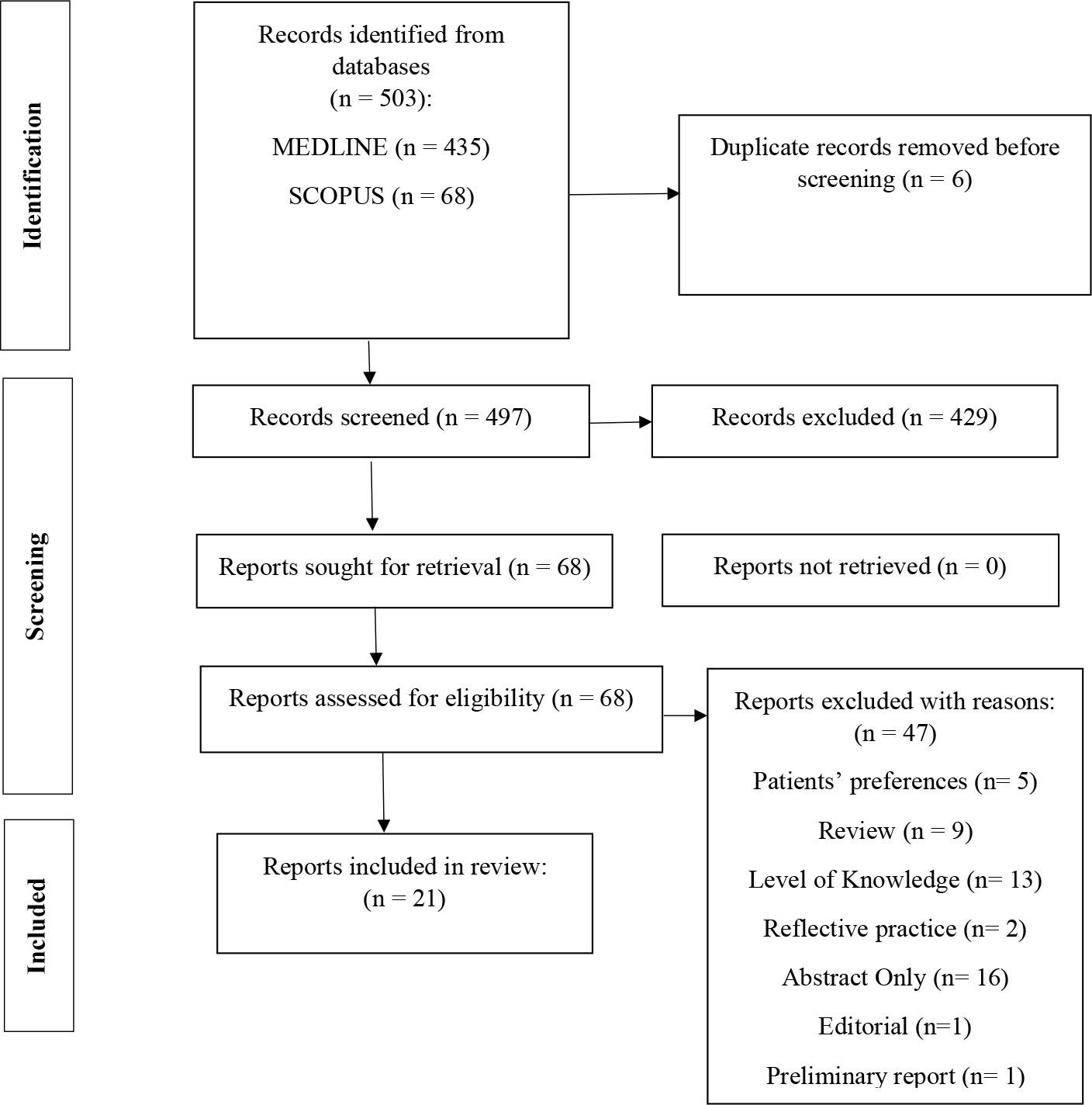 The systematic search strategy identified 503 potentially relevant articles, of which six were removed as duplicates. Of the remaining 497 articles, 429 did not meet the eligibility criteria and were therefore excluded from this review. Following screening and detailed assessment of the full text, a further 47 articles were excluded for various reasons (training programs, breaking bad news [BBN] of coronavirus disease 2019 [COVID-19] or injury, editorial letter), resulting in 21 studies being deemed appropriate for inclusion in this systematic review (Figure 1).