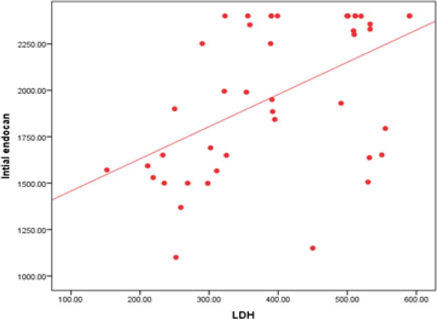 Correlation between initial endocan level and LDH level among the studied patients.