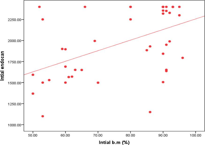 The correlation between initial endocan and initial bone marrow blasts percentage among the studied patients.