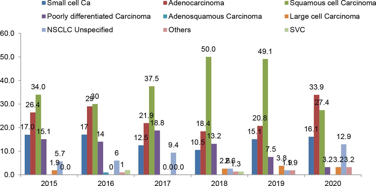| Murali et al (9) | Tamil Nadu | 678 | 3.19 | 58 | 53.4 | Adenocarcinoma (51.1%) | 7.6 (NSCLC) and 7.2 (SCLC) |