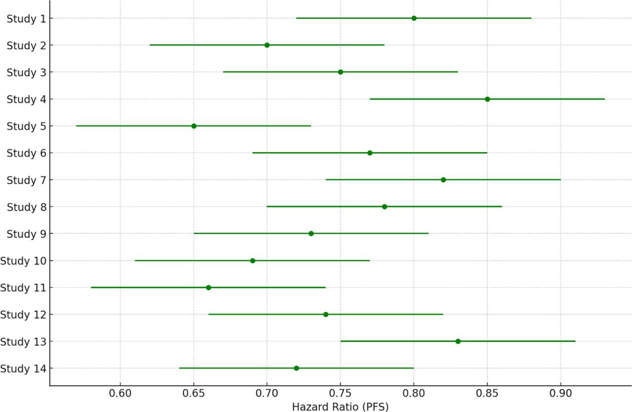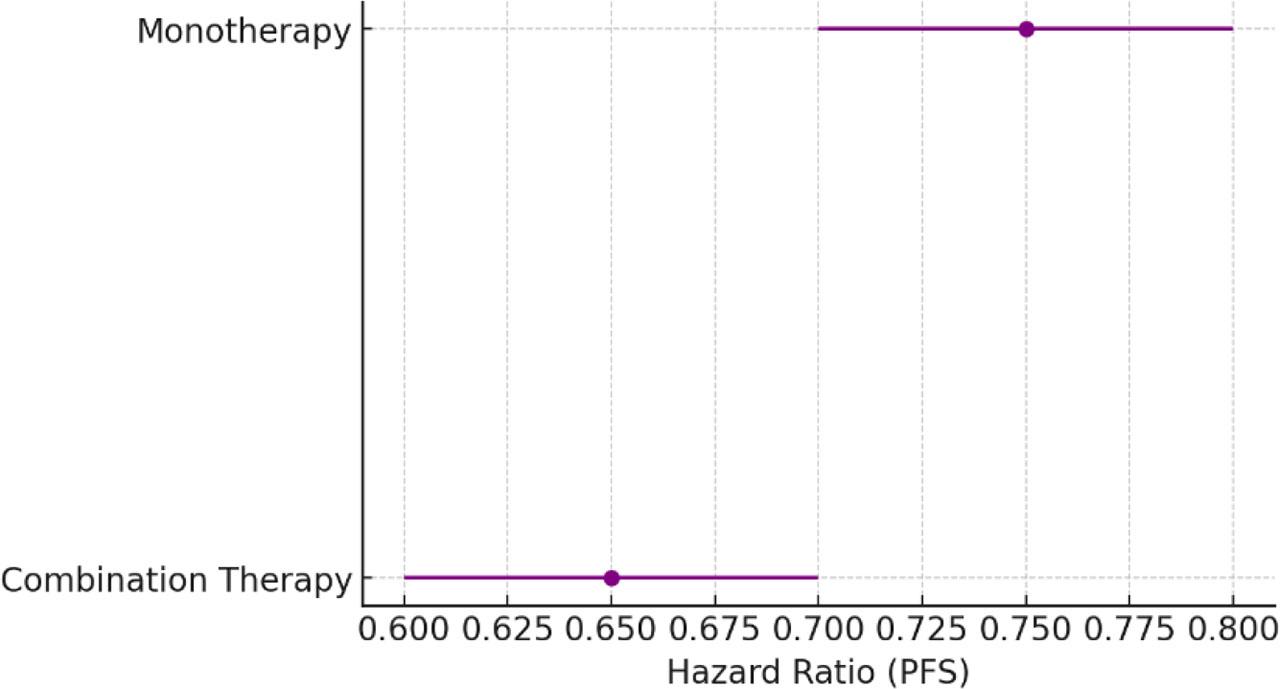 To explore the impact of treatment modality, we performed a subgroup analysis of monotherapy versus combination therapy with radiotherapy or chemotherapy. Combination therapy showed a more pronounced benefit in PFS (HR = 0.65, 95% CI: 0.52–0.80), albeit with higher toxicity.