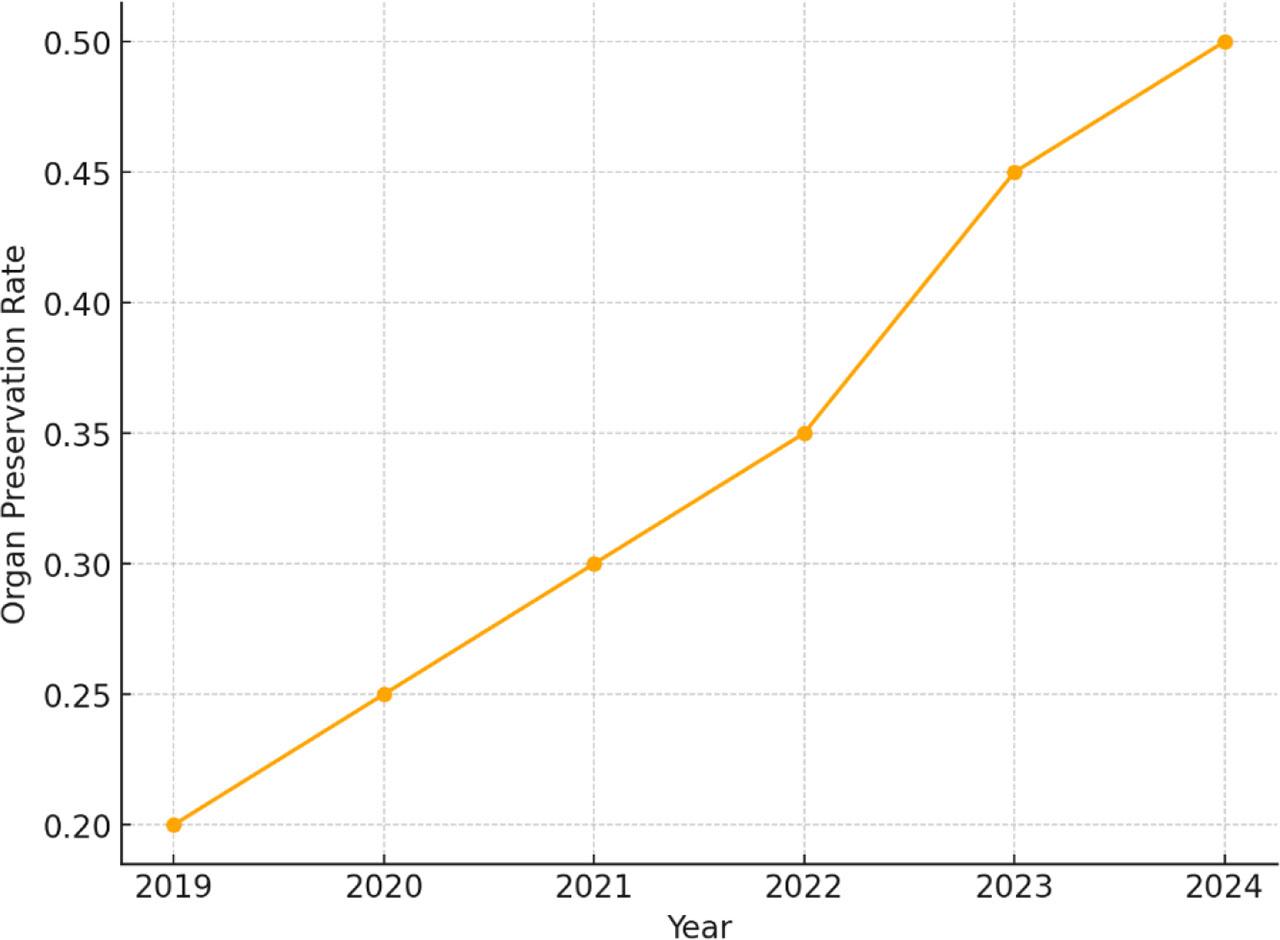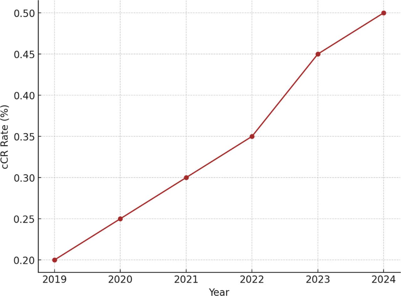 Temporal trends in clinical complete response rates from 2019 to 2024.