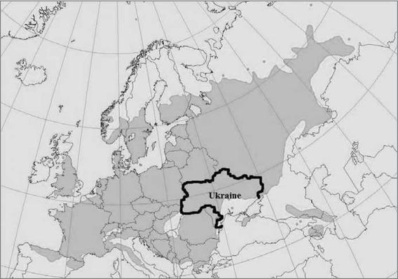 Location of the study site (grey pattern is the distribution of oak and lime stands within Ukraine and the study area)