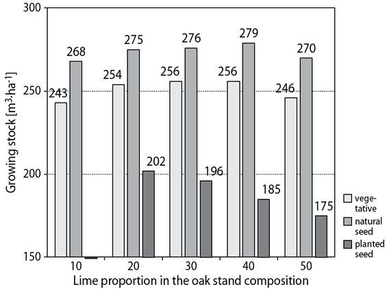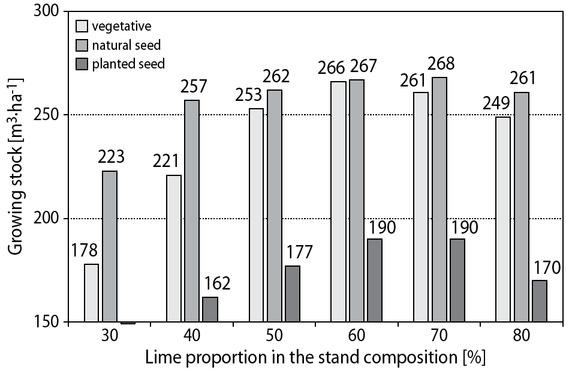 The study showed that stands of vegetative and natural seed origin with 50–70% of lime in their composition were the most productive. For example, their stock at the age of 61–70 reached 253–266 m3·ha-1 for vegetative stands and 262–268 m3·ha-1 for the stands of natural seed origin. The stands’ stock volume decreased with the increase or decrease in the lime proportion in the composition.