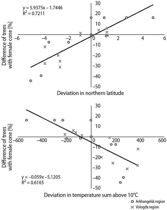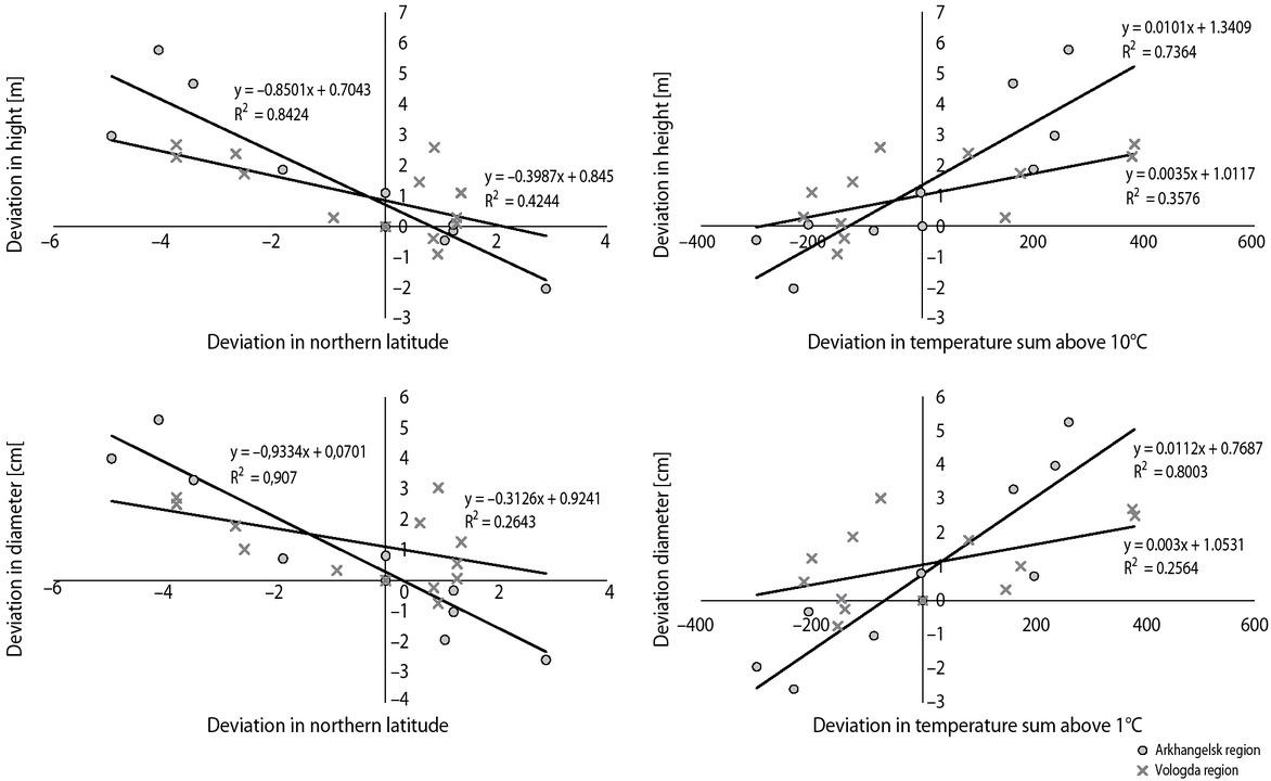 Correlation between deviations of the actual and estimated height and diameter of pine provenances and deviations of northern latitude and the sum of temperatures above 10°C of original stands from test plots