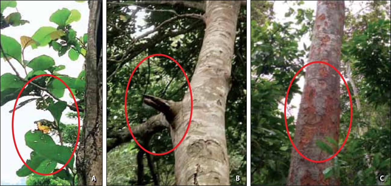 Types of damage: A – damaged foliage on teak trees (Tectona grandis); B – broken branch on jengkol trees (Achidendron pauciflorum); C – open wounds on petai trees (Parkia speciosa)