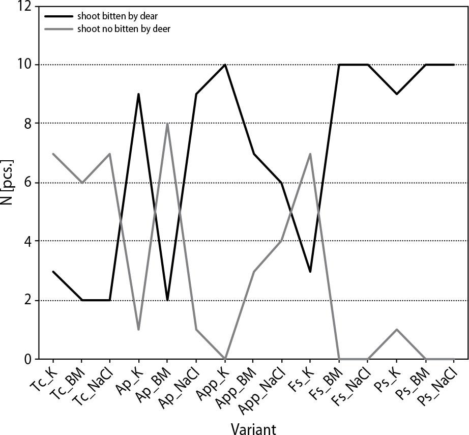 Statistical characteristics of diameter [mm] and high [cm] of experimental trees (X¯${\rm{\bar X}}$ – mean, Me – median, Min – minimum, Max – maximum, MS – variance, SD – standard deviation, V – coefficient of variation_ Homogeneous groups determined by Tukey’s test α = 0_05)