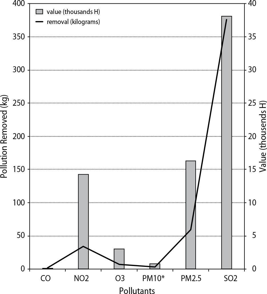 | No | Species | Oxygen (kg) | Gross carbon sequestration (kg/yr) | Number of trees | Leaf area (ha) |